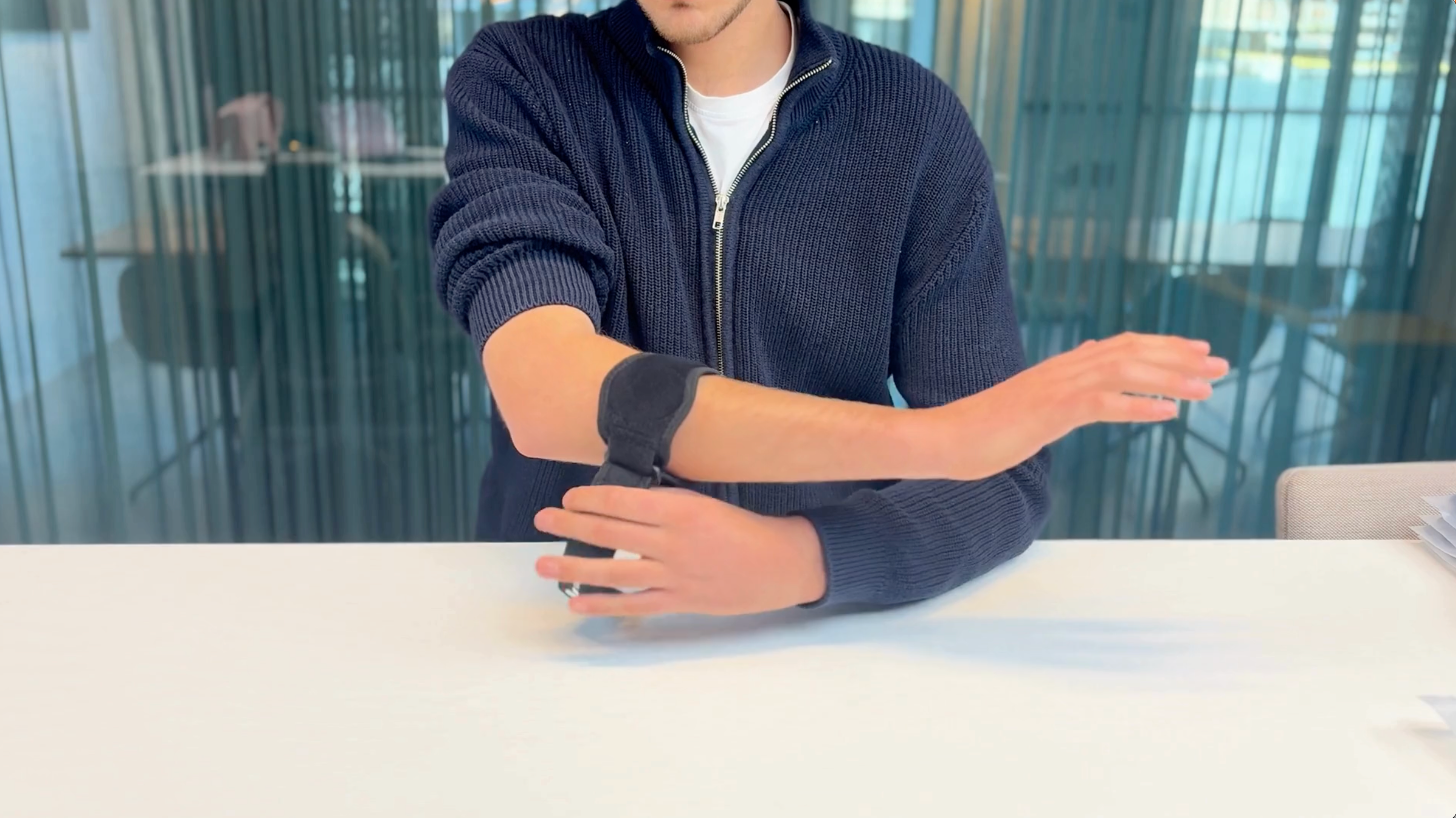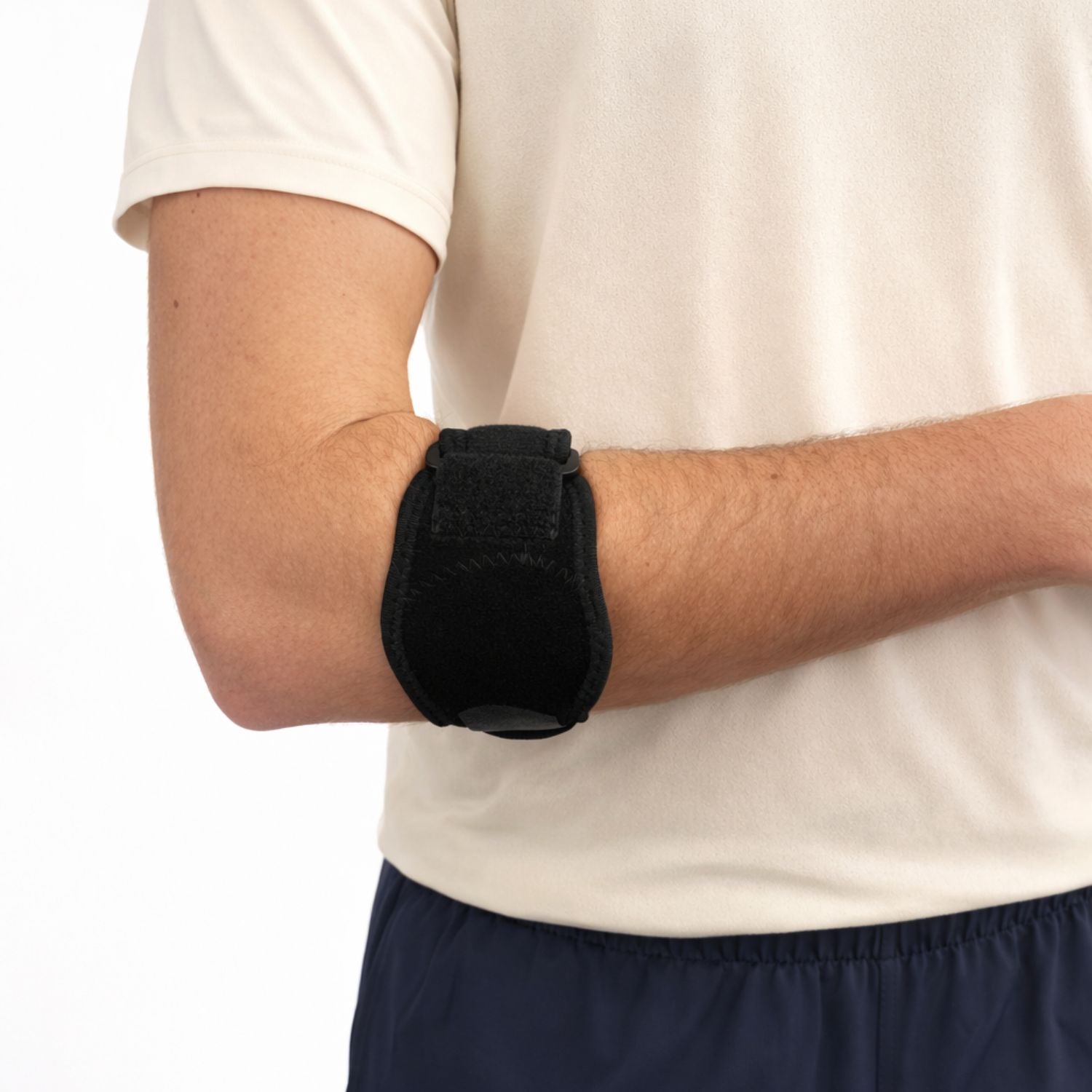 Draag de brace niet op de elleboog, maar 2–3 cm daaronder op de onderarm, zodat het drukpunt de onderarmspieren ondersteunt en de peesaanhechting wordt ontlast. Stel de band stevig maar comfortabel af. Hij moet goed blijven zitten, maar mag niet knellen.